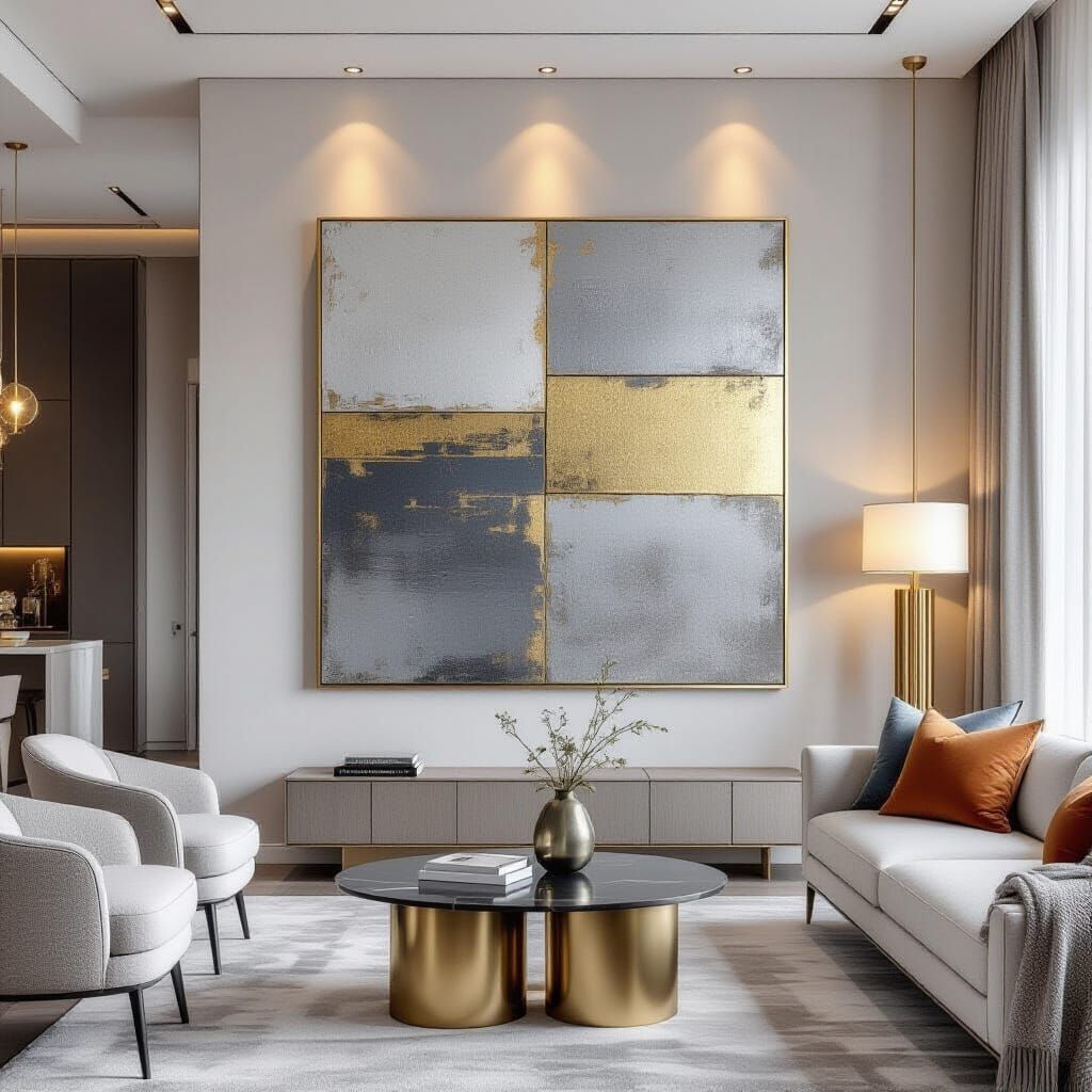 This image shows an abstract painting with metallic pewter, gold, and grey stripes in a luxurious, ultra-modern living room. The artwork features a geometric composition with subtle texture and luminous finishes.