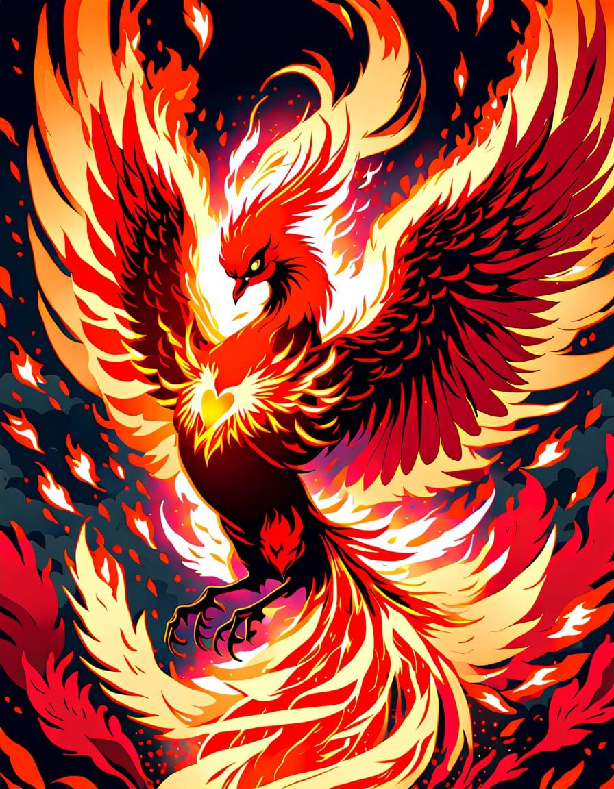 A dynamic splash art illustration of a phoenix emerging from a heart of fire. Features glowing embers, fiery feathers, and a magical aura in a crimson and gold palette.