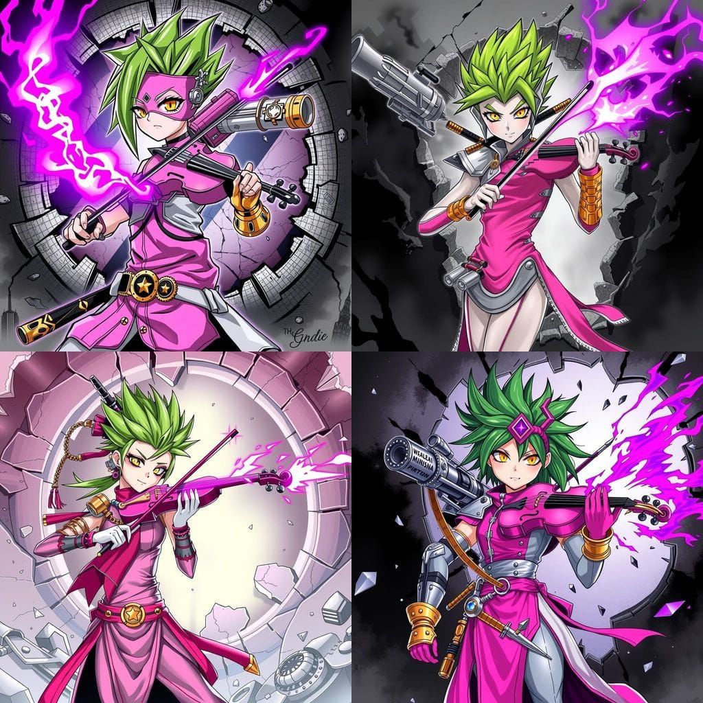 A black and white anime-style image of a gothic Barbie character with striking green hair and a steampunk ninja outfit. The artwork includes a violin engulfed in purple flames and a steam-powered cannon.