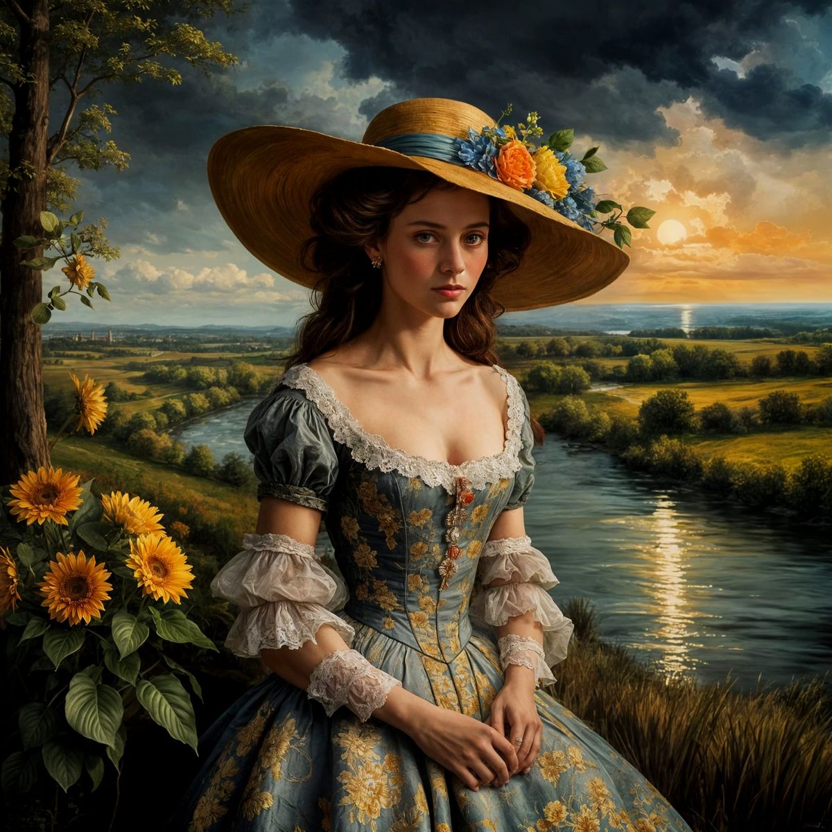 This striking portrait features a beautiful woman in 18th-century attire with a hat and jewelry. Floral patterns come to life, set against a romantic landscape inspired by Van Gogh's style. Captured in chiaroscuro lighting.