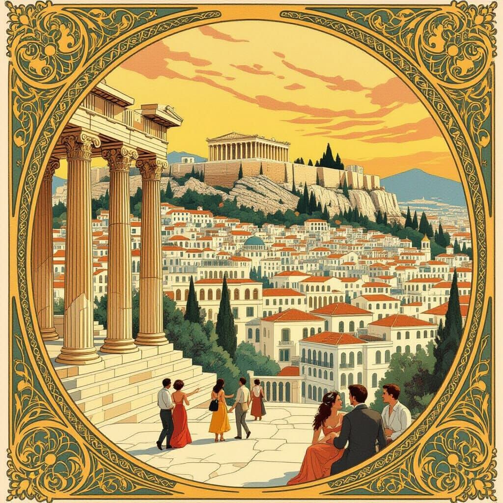 This Art Nouveau illustration depicts Athens, Greece, blending ancient columns with modern architecture. Swirling lines and golden hour light create a dreamlike scene of friendship and discovery.
