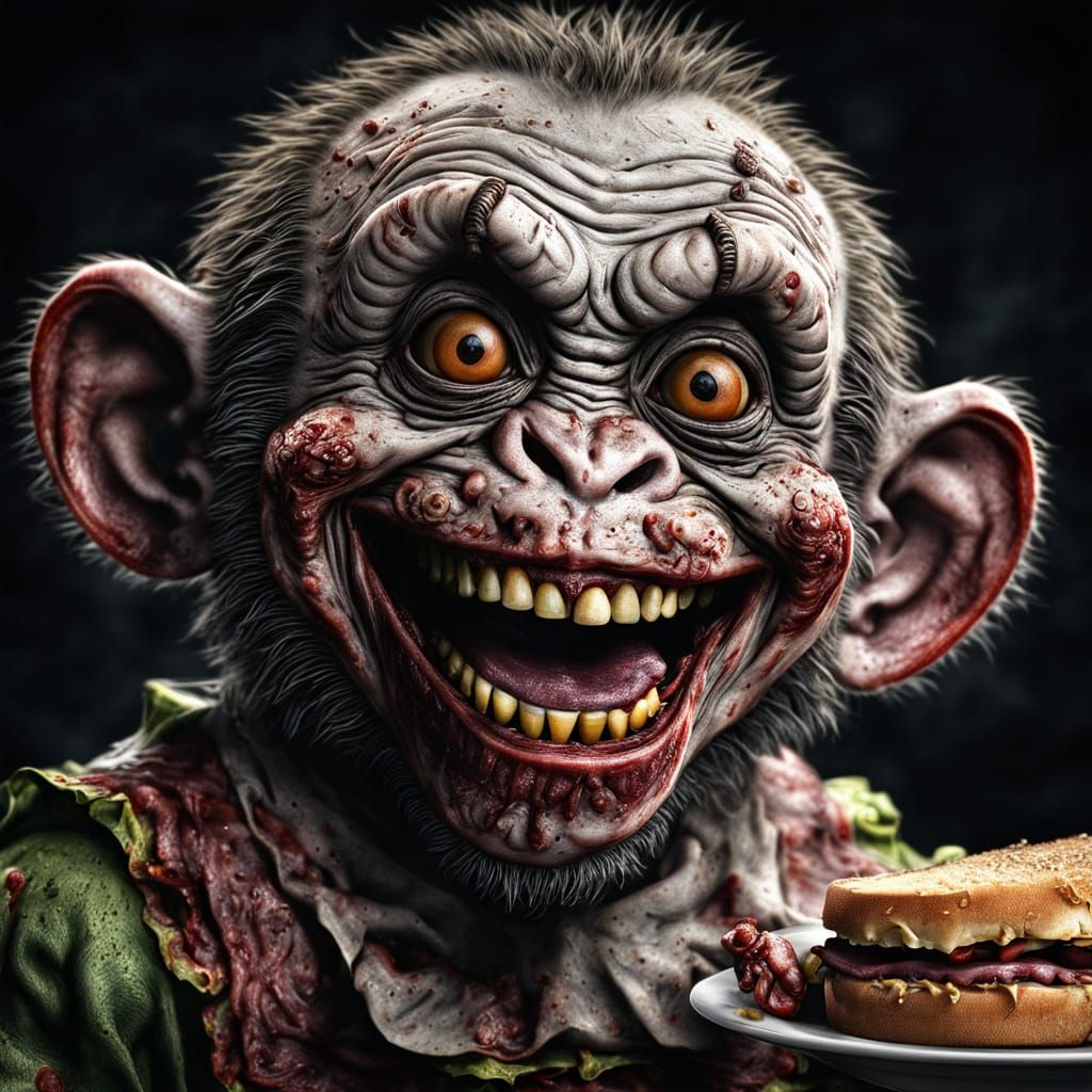 This image depicts a surreal and unsettling scene of a monstrous creature devouring a snack, captured with striking detail and atmosphere.