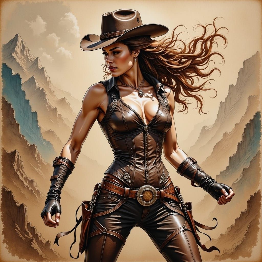 A vibrant image of a cowgirl in a dynamic pose, set against a backdrop of swirling, dreamlike colors and textures. The artwork uses bold lines and spontaneous textures in an emotive style.