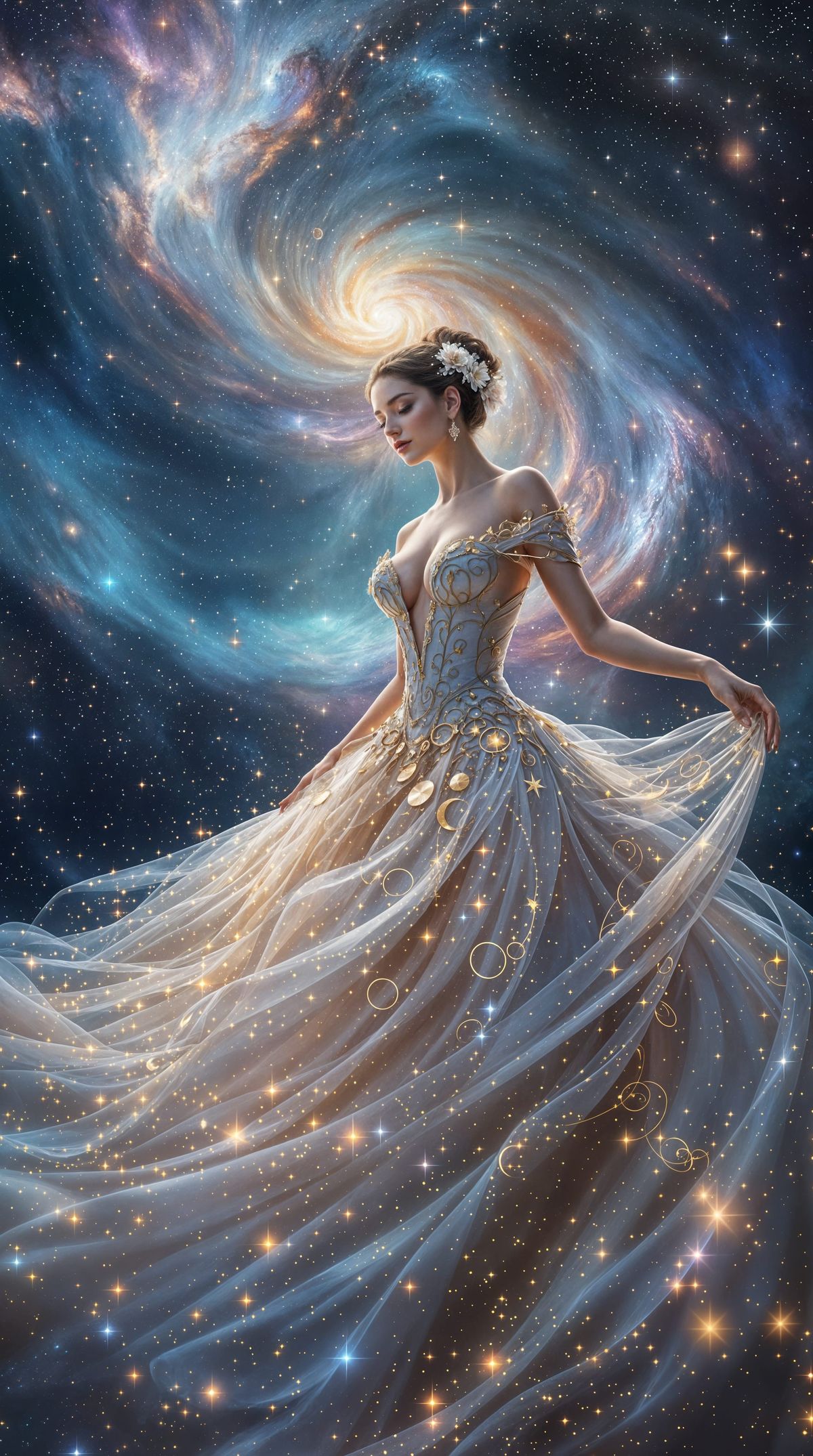 This image shows a stunning portrait of a ballerina against a breathtaking nebula backdrop, her flowing gown adorned with stars and celestial patterns, evoking a sense of ethereal beauty and cosmic wonder.