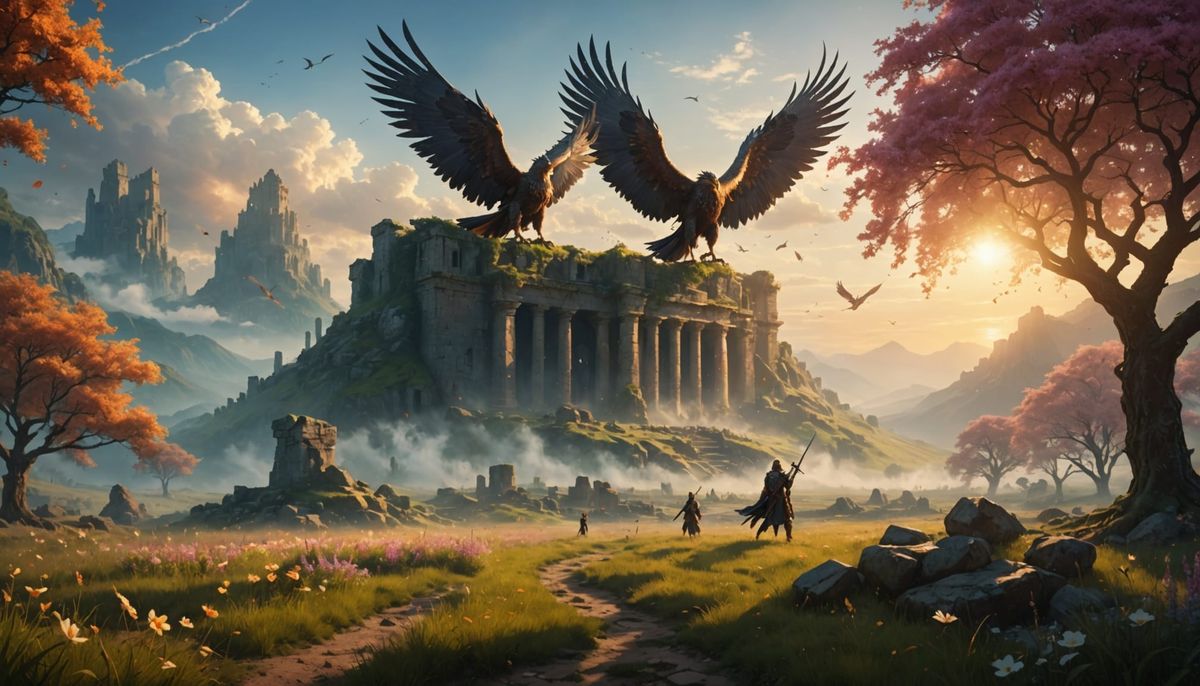 This image depicts a magical fantasy valley at sunrise, where a battlefield has transformed into a serene meadow with golden light illuminating ancient ruins. Ethereal spirits rise as a celestial phoenix soars overhead.