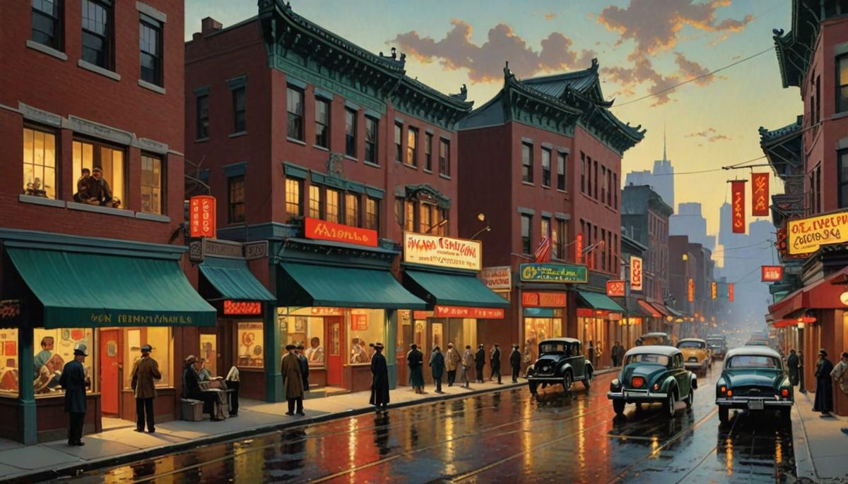 This AI-generated image depicts a bustling Chinatown street, blending the styles of Thomas Kinkade, Norman Rockwell, and Edward Hopper for a unique visual narrative.
