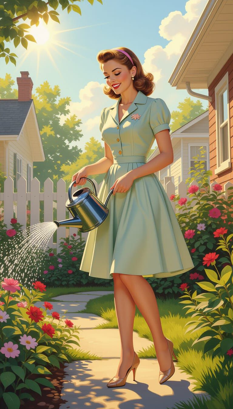 This image shows a housewife in a 1950s suburban setting watering plants. The hyperrealistic splash art captures a mid-shot with intricate details, side lighting, and a colorful background.