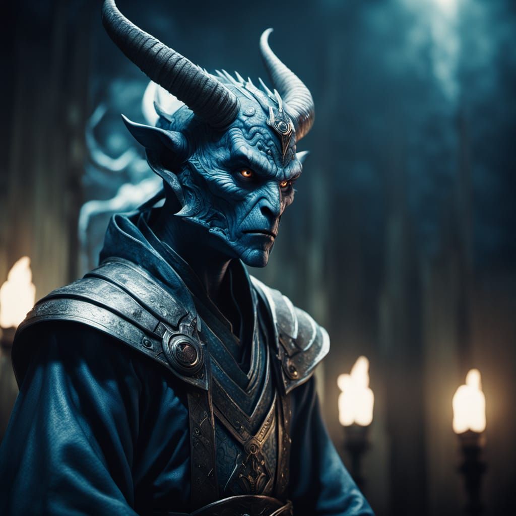 This digital matte painting depicts an old tiefling warrior in a blue and silver robe, showcasing intricate armor and weathered features. It features dramatic atmospheric lighting and a cool color palette, rendered in a maximalist, 8k concept art style.