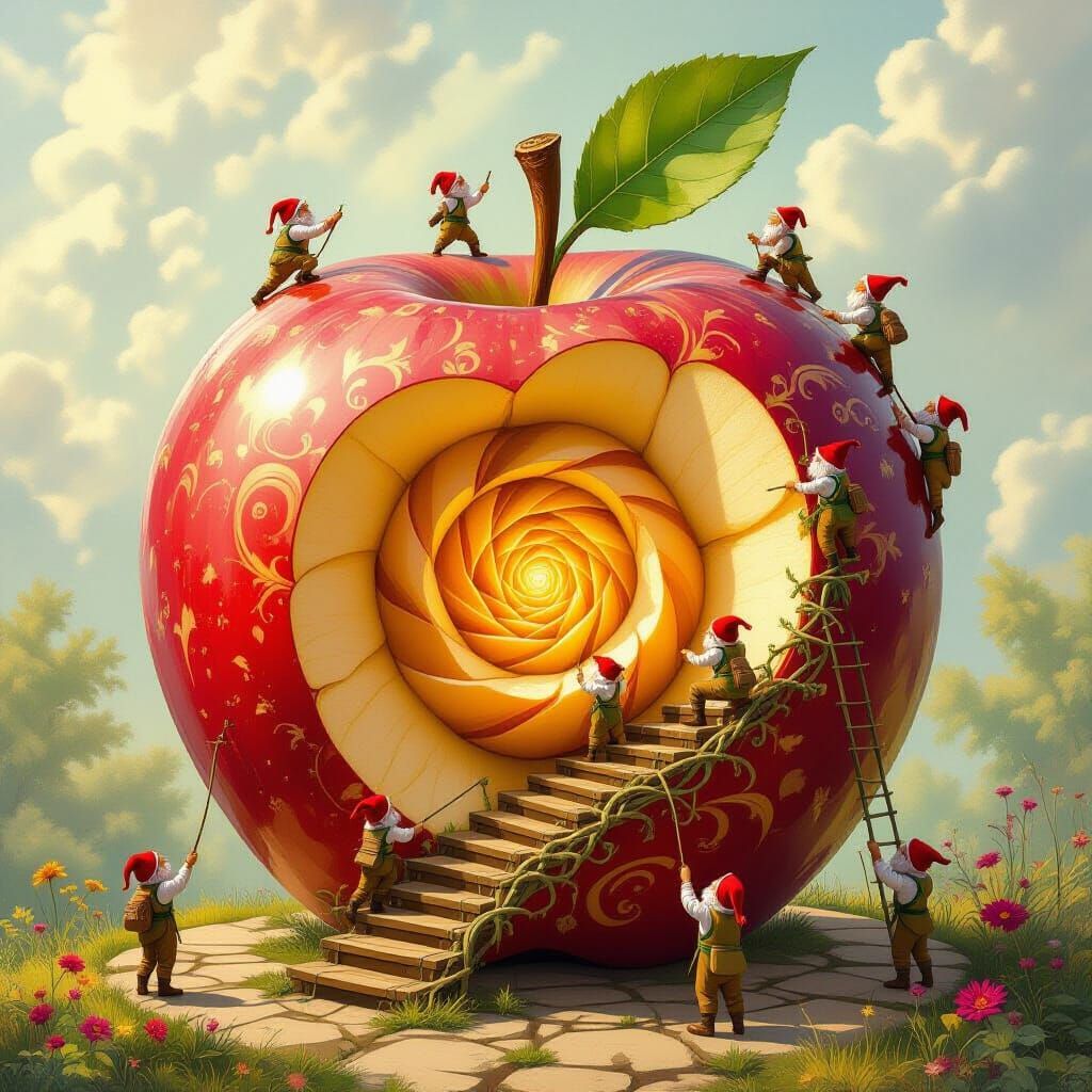 A spectacular apple, inside which is the art of fruit sculpture, a cut inside it that creates miniature stairs that revolve around it to the top, dwarfs climb them, some reach the top, at the top of the apple is a miniature ladder where they grab onto the branch and the leaf, and one dwarf is already ...