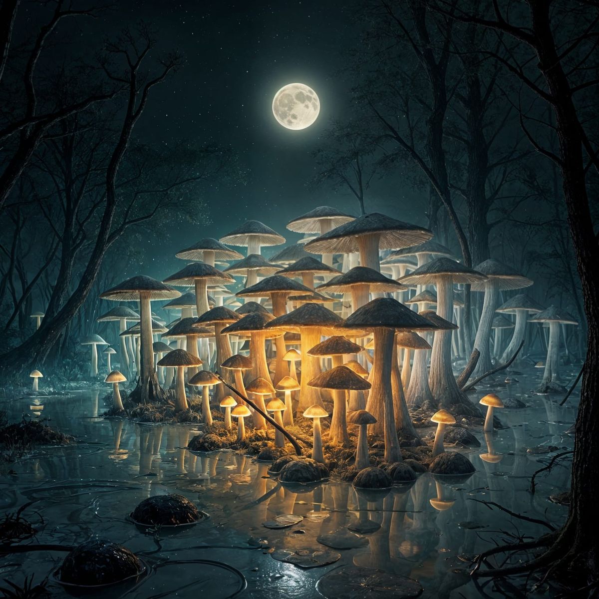 This image captures a breathtaking scene of a mountain of glowing mushrooms in a misty Louisiana swamp at night, with intricate details and dramatic lighting