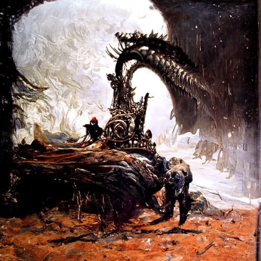 This image shows a dragon king in a post-apocalyptic landscape. The artwork evokes horror through detailed engravings and dramatic lighting.