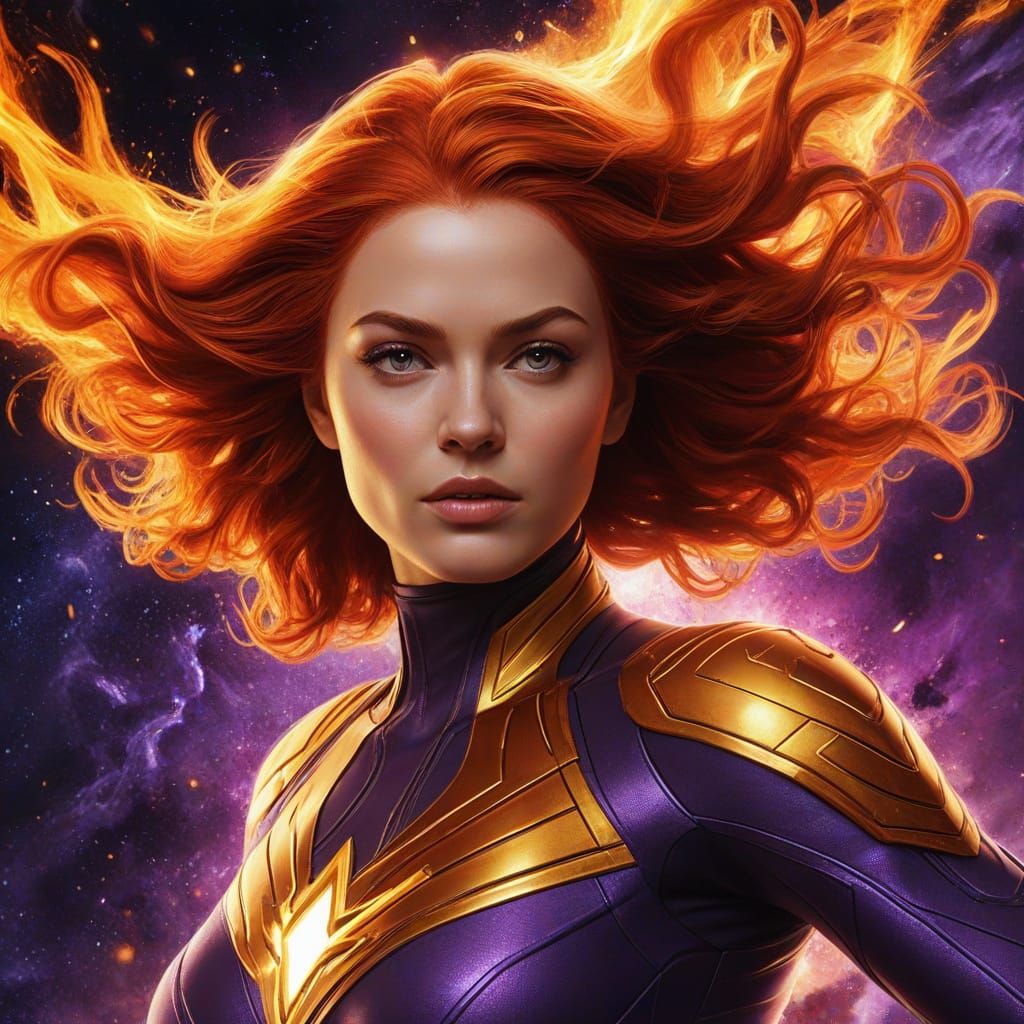 A striking picture of Jean Grey as the Phoenix amidst a cosmic explosion in space. This digital painting features vibrant purple and orange hues, blazing stardust, and dynamic golden lighting against a galactic backdrop.