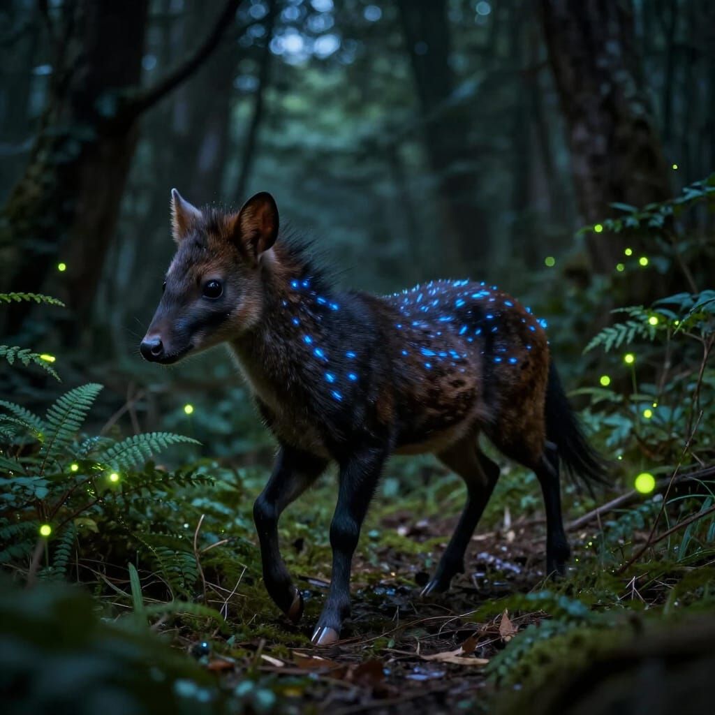This image shows a small, photorealistic creature with hooves and a horse-like face in a dark forest. Green fireflies glow around the black and brown spotted animal, which features striking blue stripes.