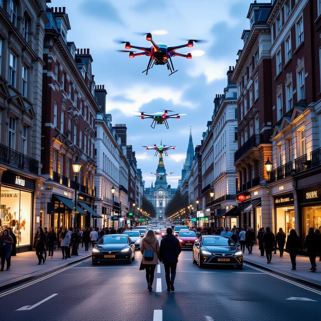 Generate your own high-resolution images of future London streets with flying cars and delivery drones. Free and easy to use!