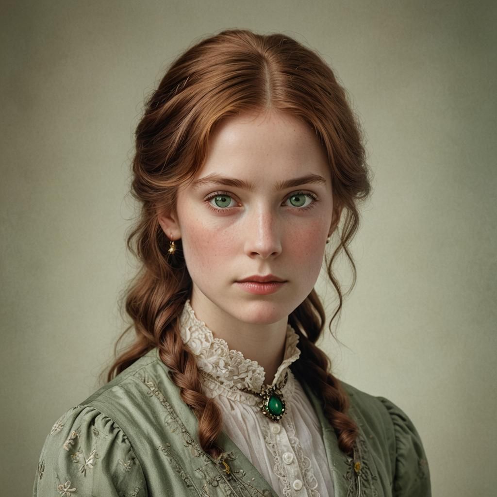 A close-up portrait of a young Victorian woman with auburn hair and green eyes. The refined image uses soft bokeh and precise studio lighting to highlight her features in a classic photography style.