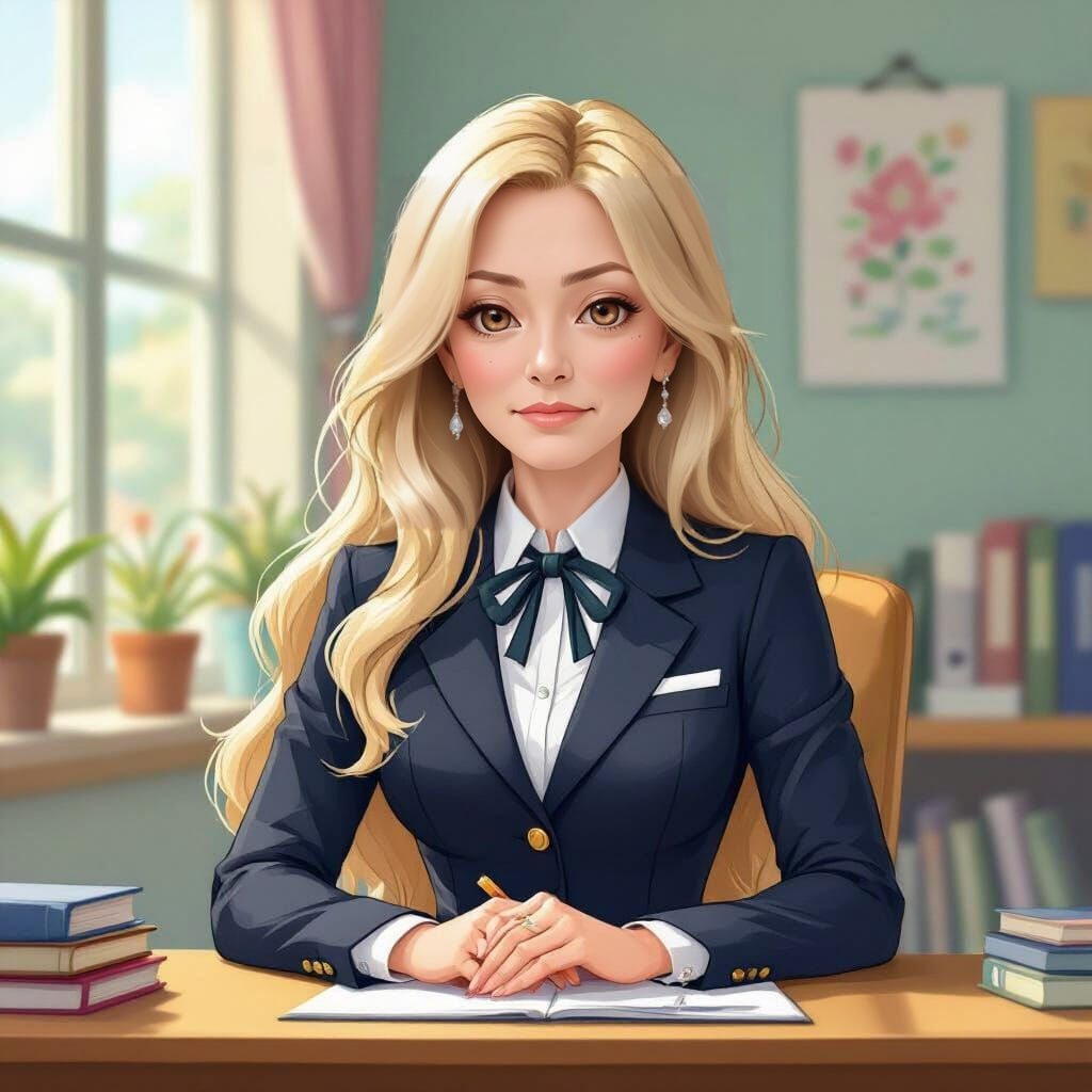 A vibrant cartoon depiction of Teacher Rosario, a blonde woman in an elegant outfit, seated at her desk. The art style features bold lines and pastel colors, inspired by animation and digital painting.
