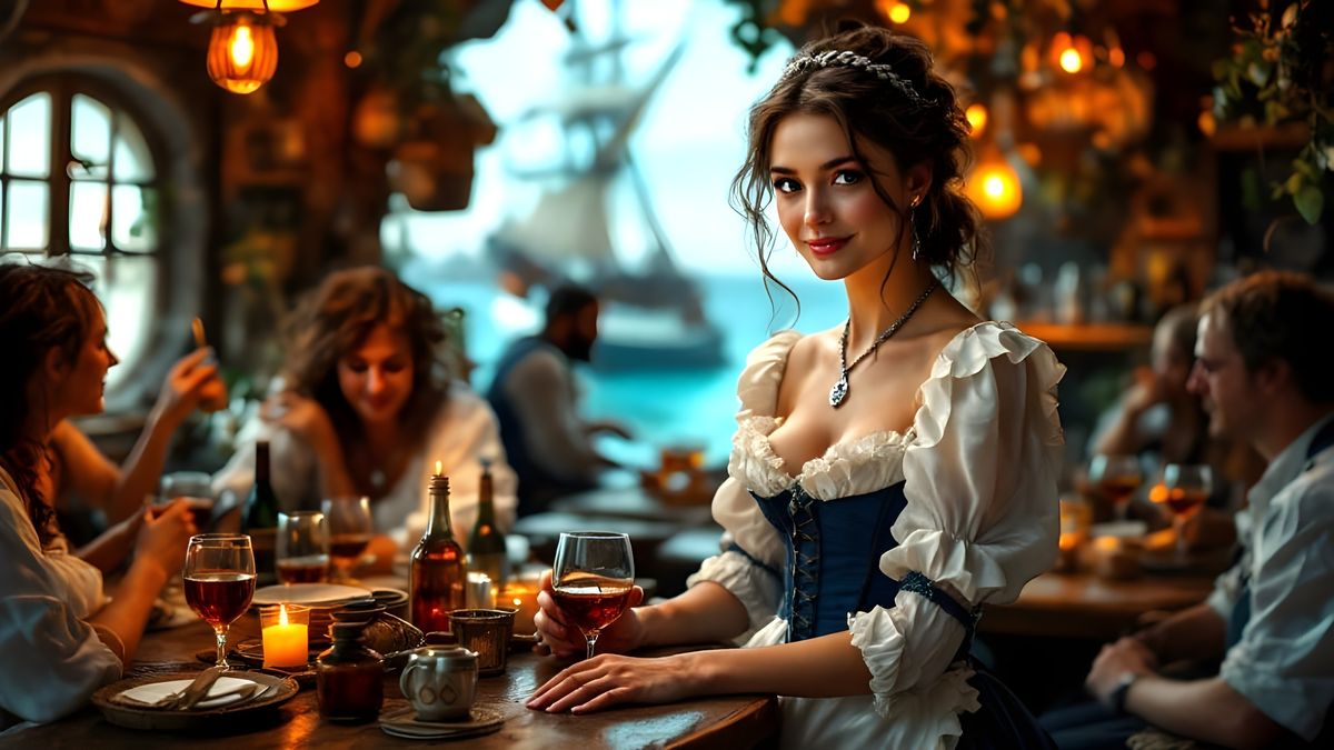 A charming woman in a rustic tavern, serving whiskey to sailors, surrounded by warm lighting and nostalgic charm, reminiscent of traditional illustrations and atmospheric portraits