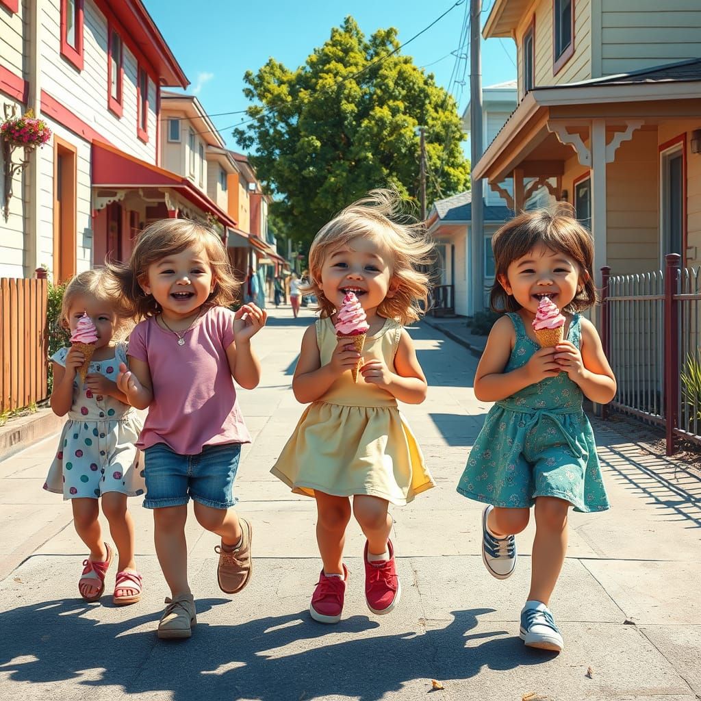 A vibrant street scene of children enjoying ice cream on a sunny summer day. The artwork features hyperdetailed elements and cool tones reminiscent of airbrush art.