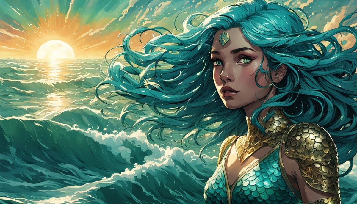 This image shows a turquoise-haired siren rising from the ocean. Iridescent scales shimmer in soft, golden light, rendered with vibrant, oceanic colors in a comic book art style.