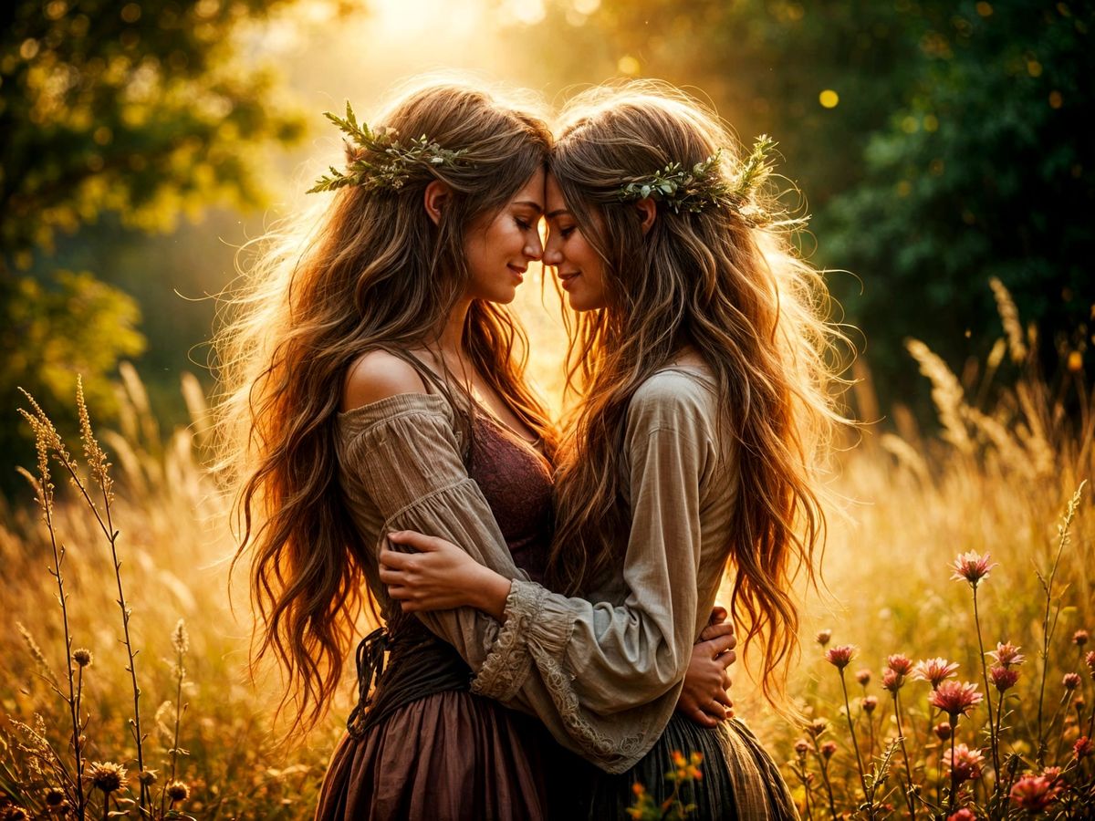 A stunning image of two female elves embracing in a sun-kissed meadow, captured in hyperrealistic detail with shallow depth of field and vibrant, magical lighting.