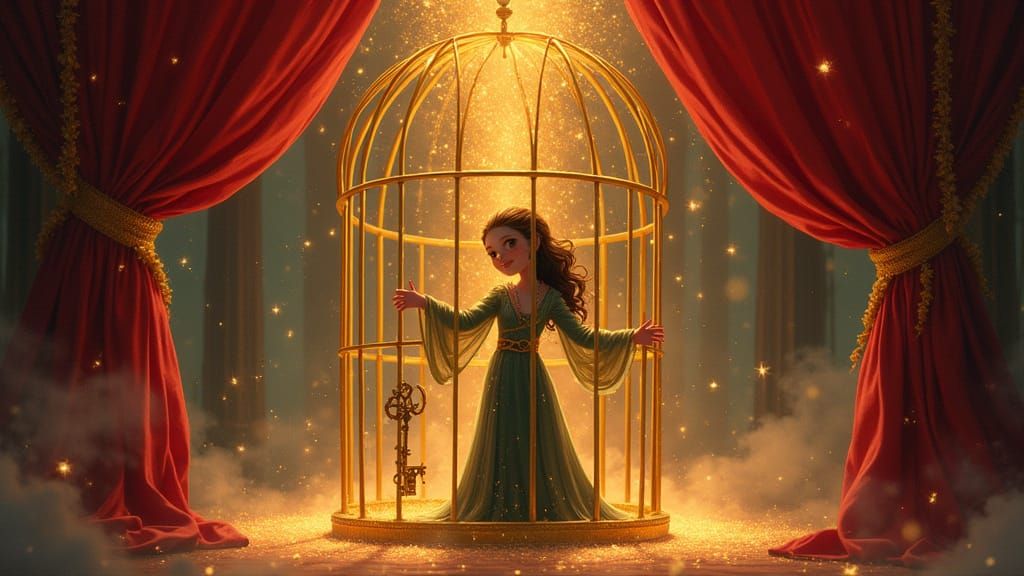 This image shows a character dressed in elegant clothing, happily turning a key in a golden cage. Magical sparkles rise, filling the air with a mystical aura in a whimsical, vibrant style.