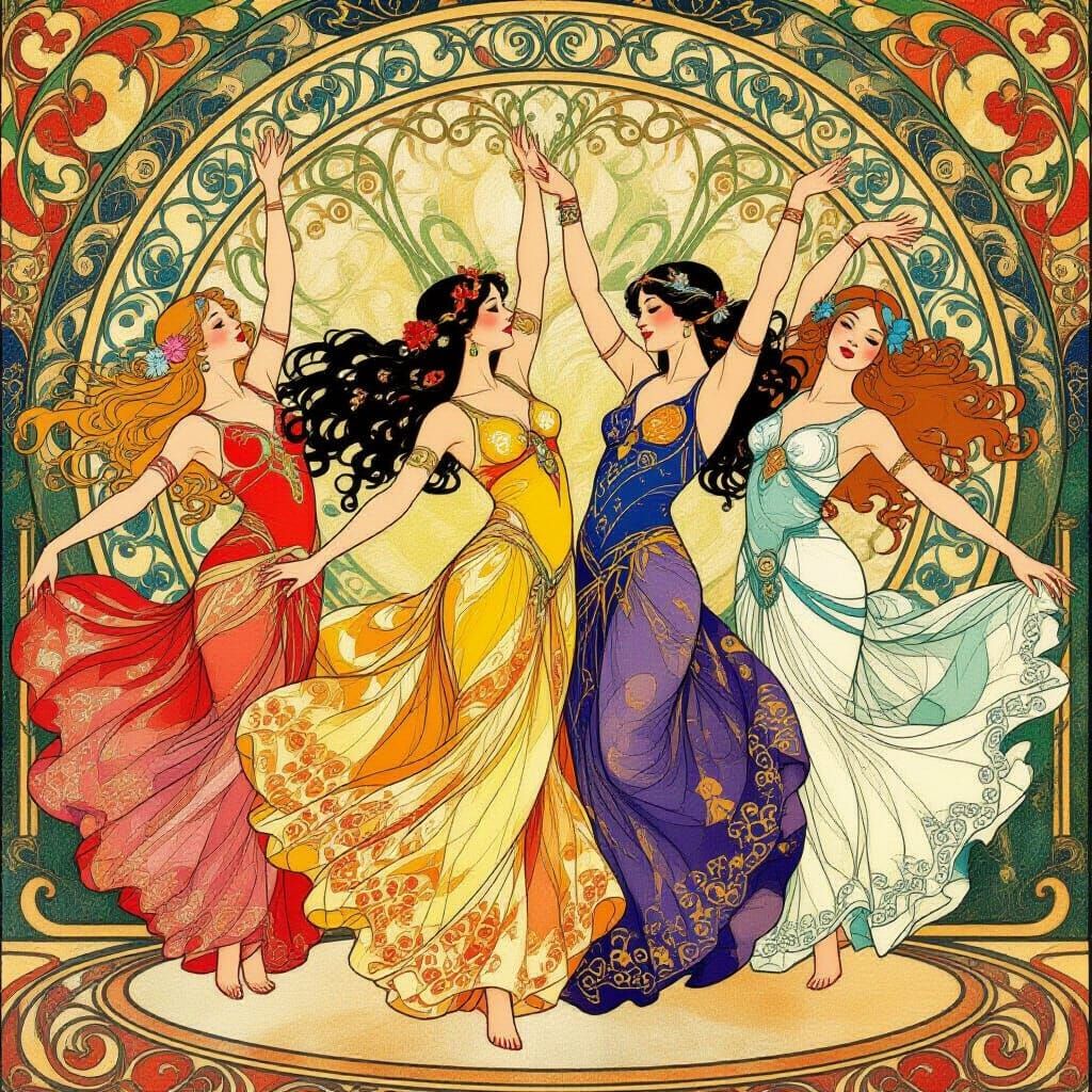This image shows five women in stunning, colorful dresses performing acrobatic dance. The art style is inspired by Art Nouveau and incorporates elegant, swirling movements.