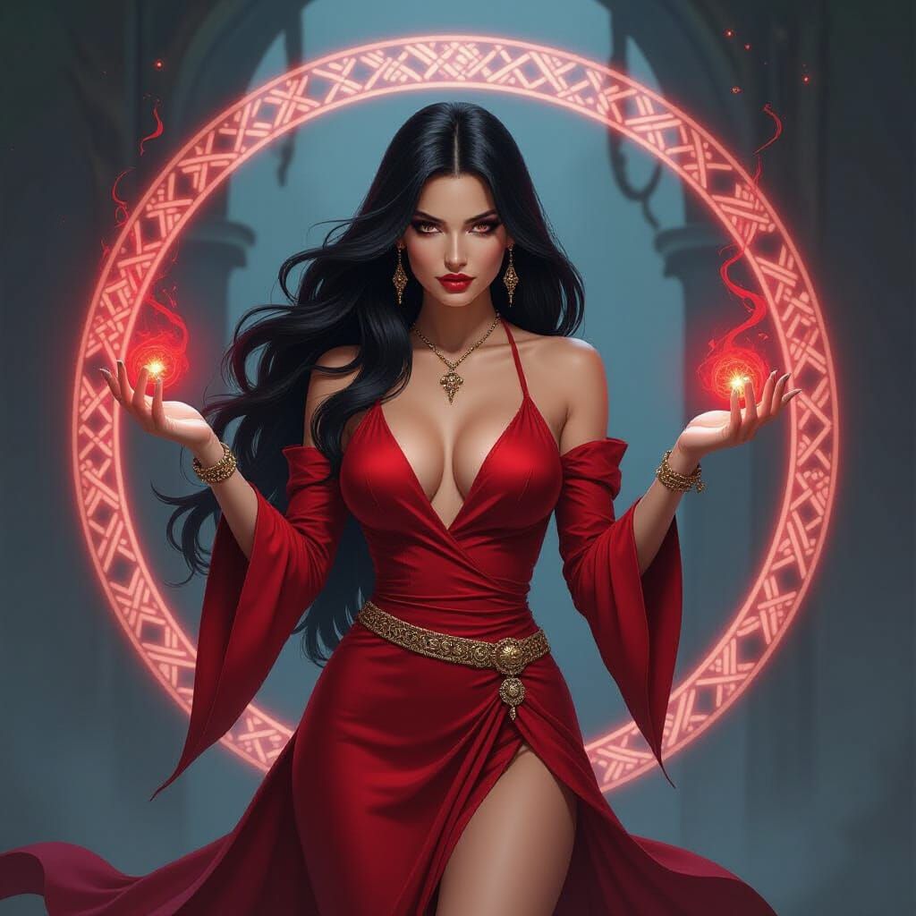 A captivating image of a dark mage named Nerith with black hair and a red dress. The mage is surrounded by a glowing runic circle, rendered with a dark fantasy aesthetic.