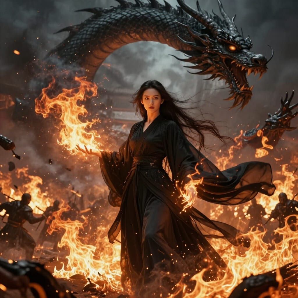 A commanding Asian woman with calm fury wields fire on a burning battlefield, a dragon overhead. Cinematic realism with high contrast and a mythic atmosphere.