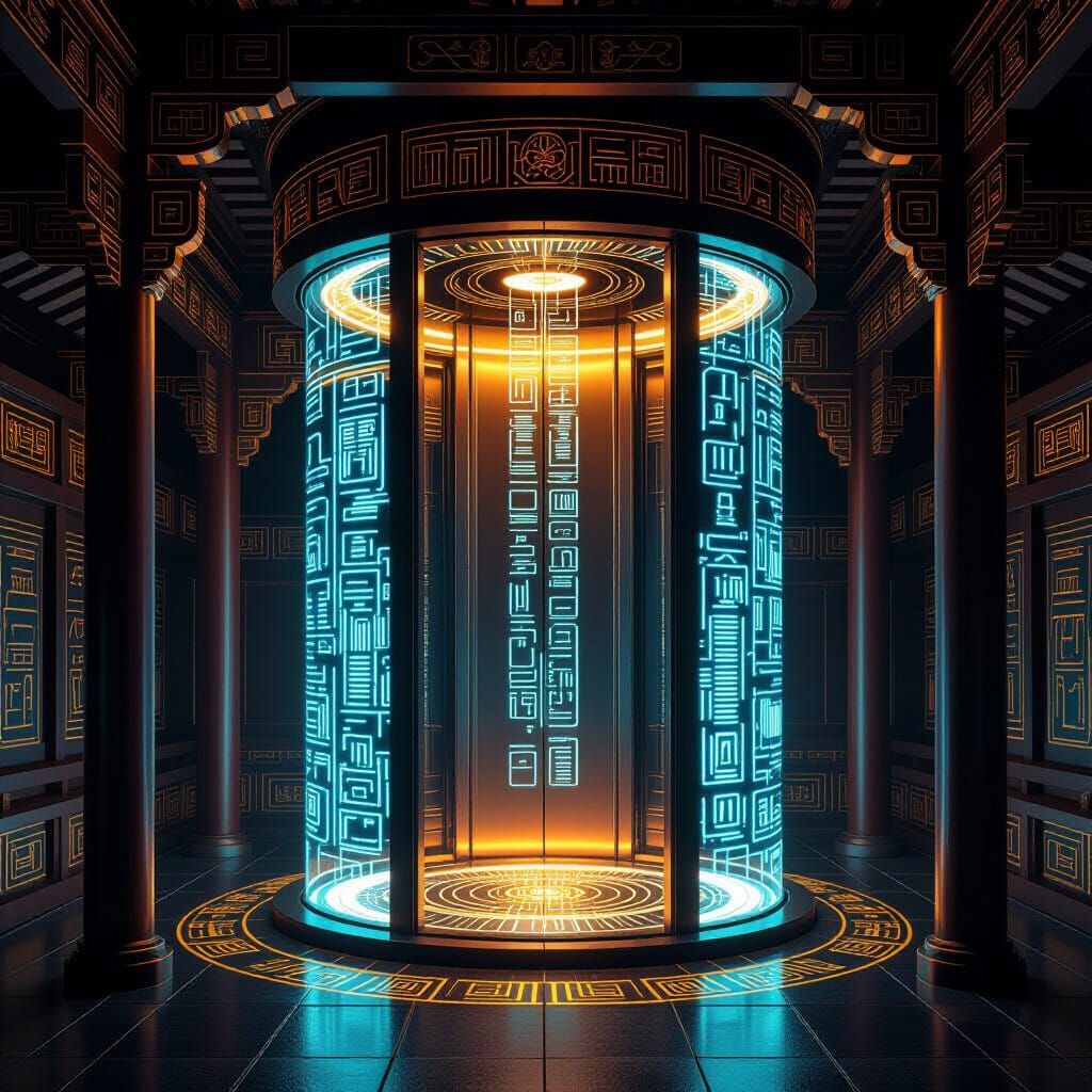 This image depicts a multi-layered lift chamber merging traditional Japanese temple architecture with a futuristic glow. Inside, a minimalist capsule features Incan-inspired glowing controls and holographic Egyptian hieroglyphs.