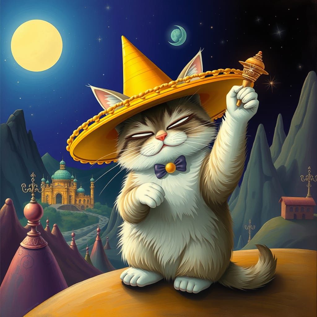 A surreal image of a cat magician with a hidden city in their hat. Rendered in a fantastical style, it evokes a dreamlike and mystical atmosphere.