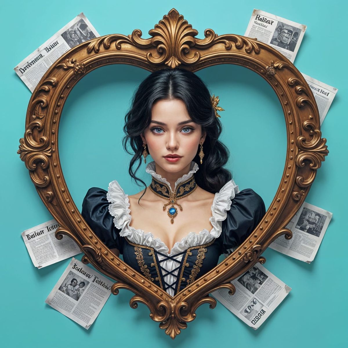 This image depicts a woman with dark hair emerging from a heart-shaped frame, holding newspapers. The artwork features a smooth blue textured background and a baroque aesthetic.