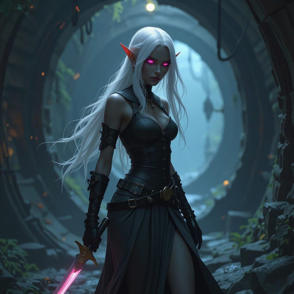 A striking picture of a dark elf exploring an underground city. The image features dramatic lighting and intricate lines with purple and yellow complementary colors in a dark fantasy aesthetic.