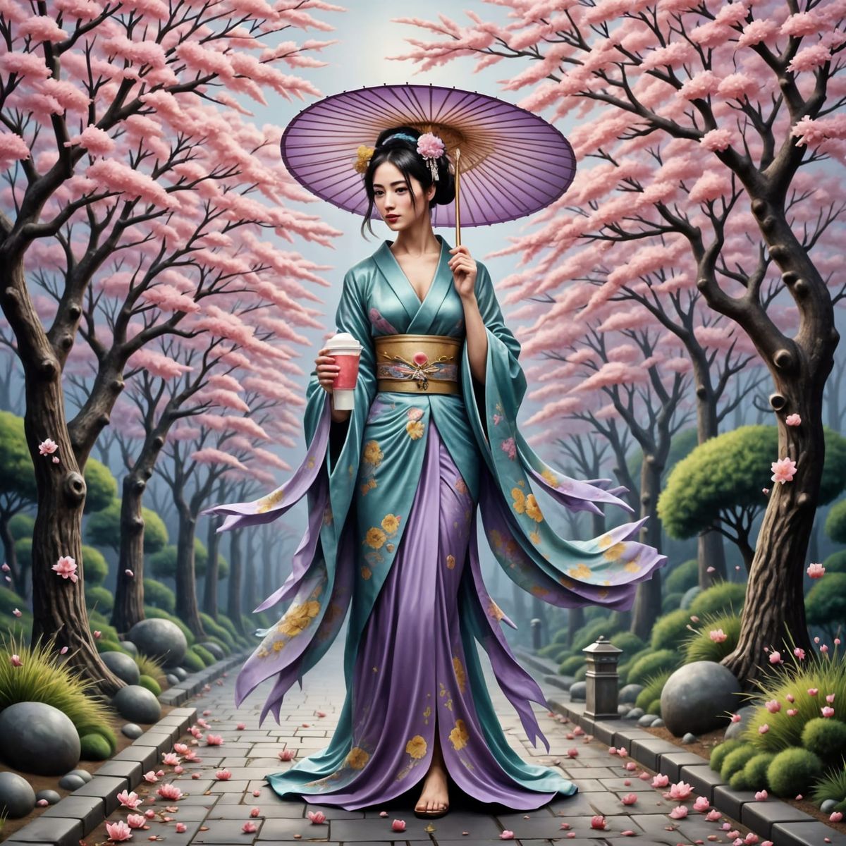 This photorealistic image shows a geisha in an ornate purple and teal kimono, holding a parasol and a cup of Sakura Cherry Shaved Ice.