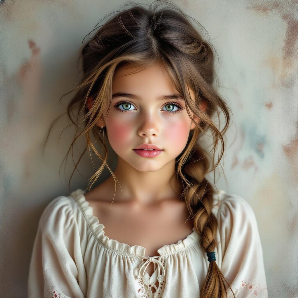 A detailed close-up portrait of a girl in flowing clothes, rendered with hyperrealistic textures and soft lighting. The image evokes a cinematic and atmospheric mood.
