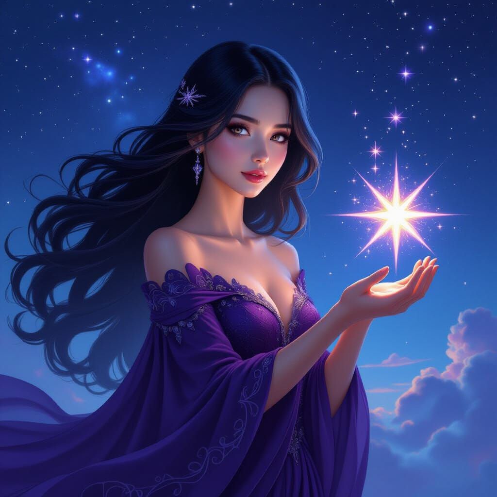 A digital painting of a woman with long black hair in a cosmic setting. She wears an intricate purple dress and holds a glowing star while soaring through space in a spaceship, in a celestial digital art style.