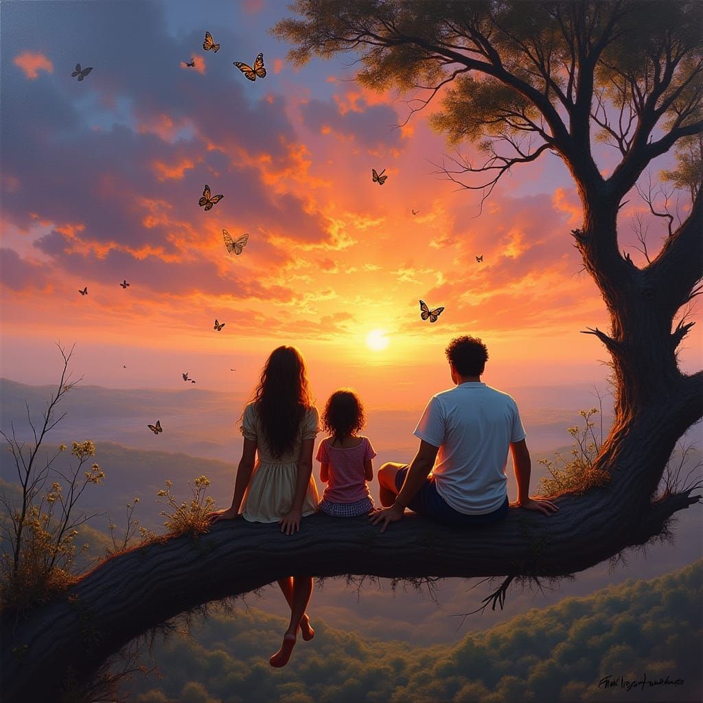 This oil painting depicts a family on a tree branch viewing a vibrant African bushveld sunset. Butterflies flutter around them in a style reminiscent of dramatic impressionistic art.