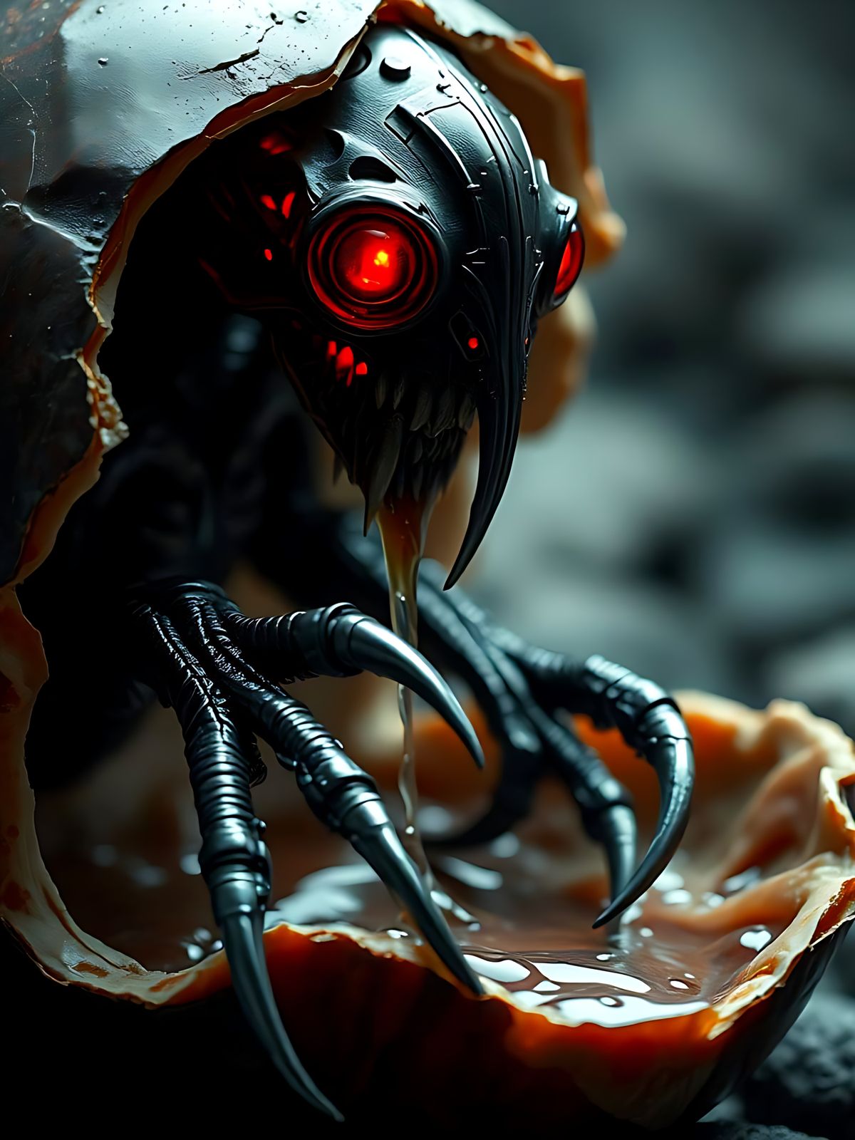 Highly creative. Dark fantasy concept art. Close-up shot. An unsettling, biomechanical creature with glowing red eyes and sharp metallic talons emerges from a cracked, obsidian egg. Dripping viscous fluid, sharp focus. Art by Wayne Barlowe and H.R. Giger. Intricate, disturbing details on the creature's ...