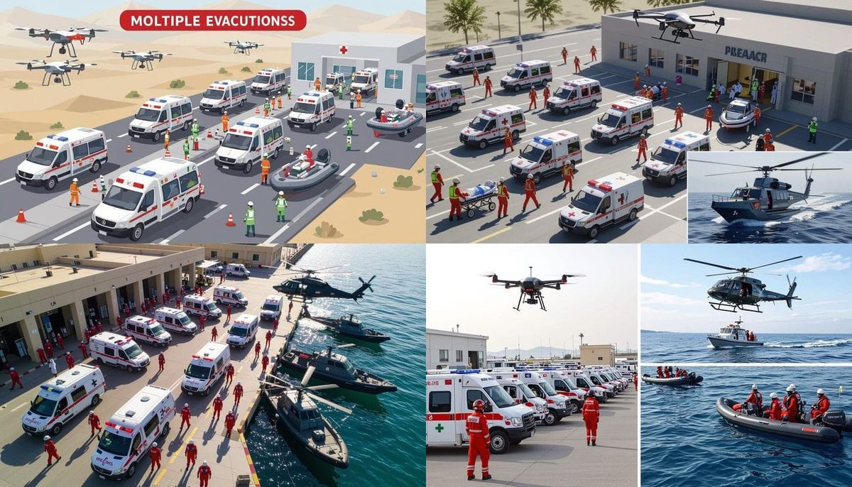 This image depicts a large-scale military medical evacuation. It shows ambulances, medical personnel, and transport aircraft involved in transferring patients to a military hospital.