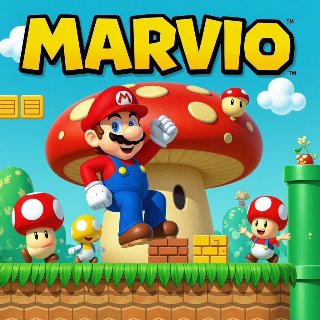 This image shows Mario sitting on a mushroom, rendered in the iconic style of the Mushroom Kingdom. A playful scene reminiscent of classic video games.