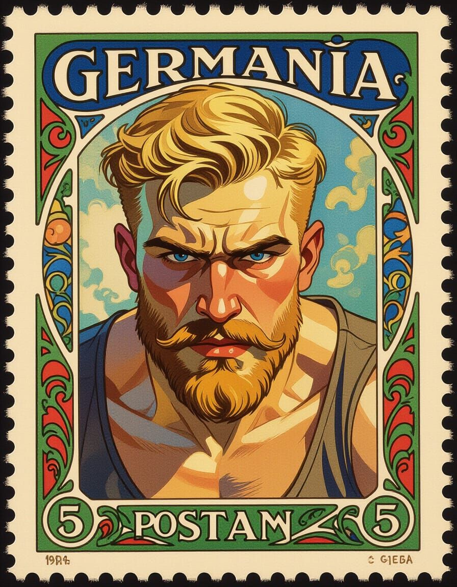 A vibrant Art Nouveau oil painting of an angry blonde man against a stylized postal stamp background. The artwork employs vivid colors, cubist elements and soft lighting.