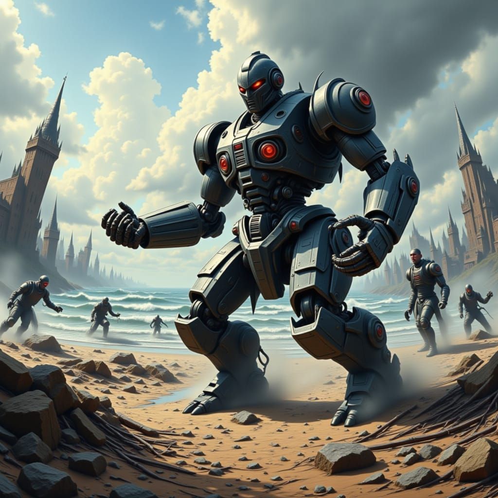 This image depicts robotic Viking warriors arriving on a shoreline, blending futuristic technology with historical warrior aesthetics.