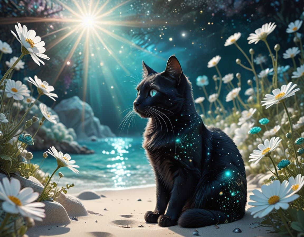 This image shows a black cat sitting on a sunny beach, surrounded by glowing flowers and shimmering waves in a vibrant, ethereal atmosphere. Soft focus and high contrast create a dreamlike effect, while abstract fractal patterns and zentangle-inspired details add a touch of mysticism and magic realism.