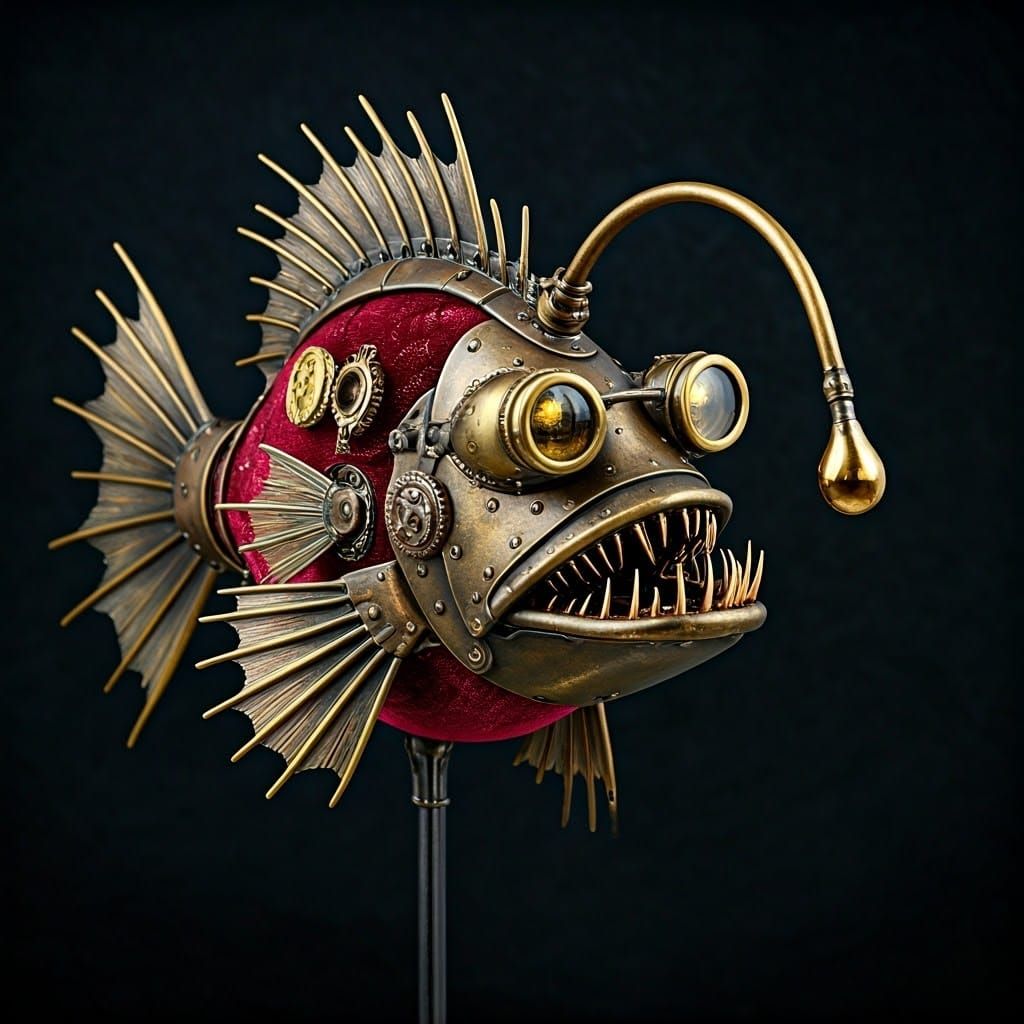 This image depicts a fantastical deep-sea angler fish, reimagined in a steampunk aesthetic with intricate brass and copper details, glowing LED lights, and an ornate, symmetrical design.