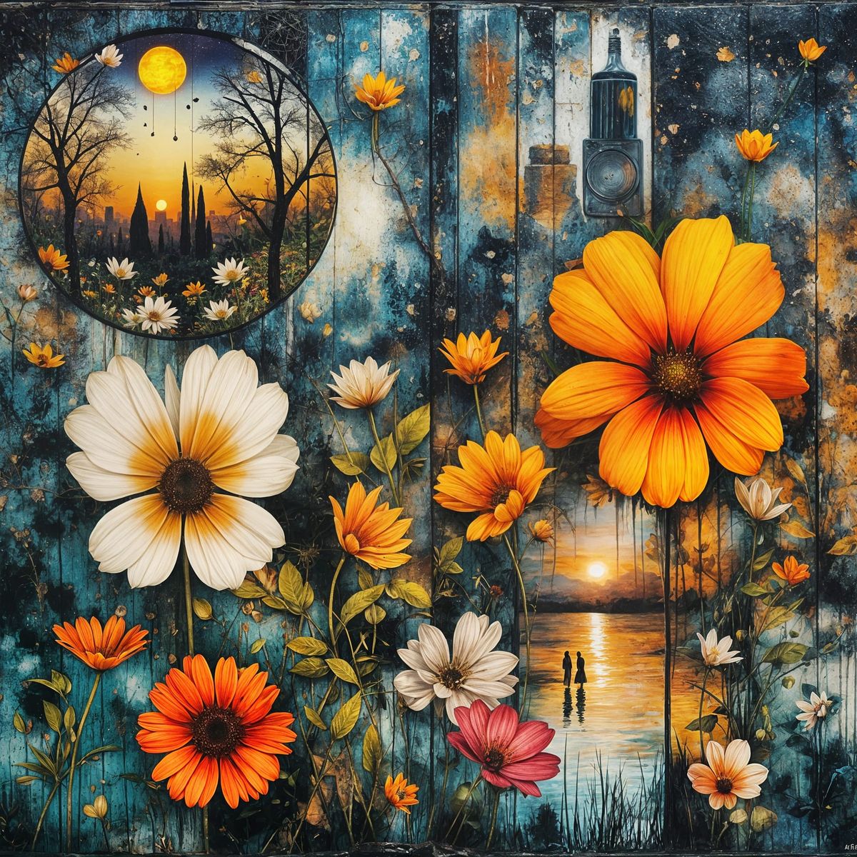 This image shows a symmetrical flower blooming in the warm sunlight. The flower is captured in a mixed media style, highlighting its delicate petals.