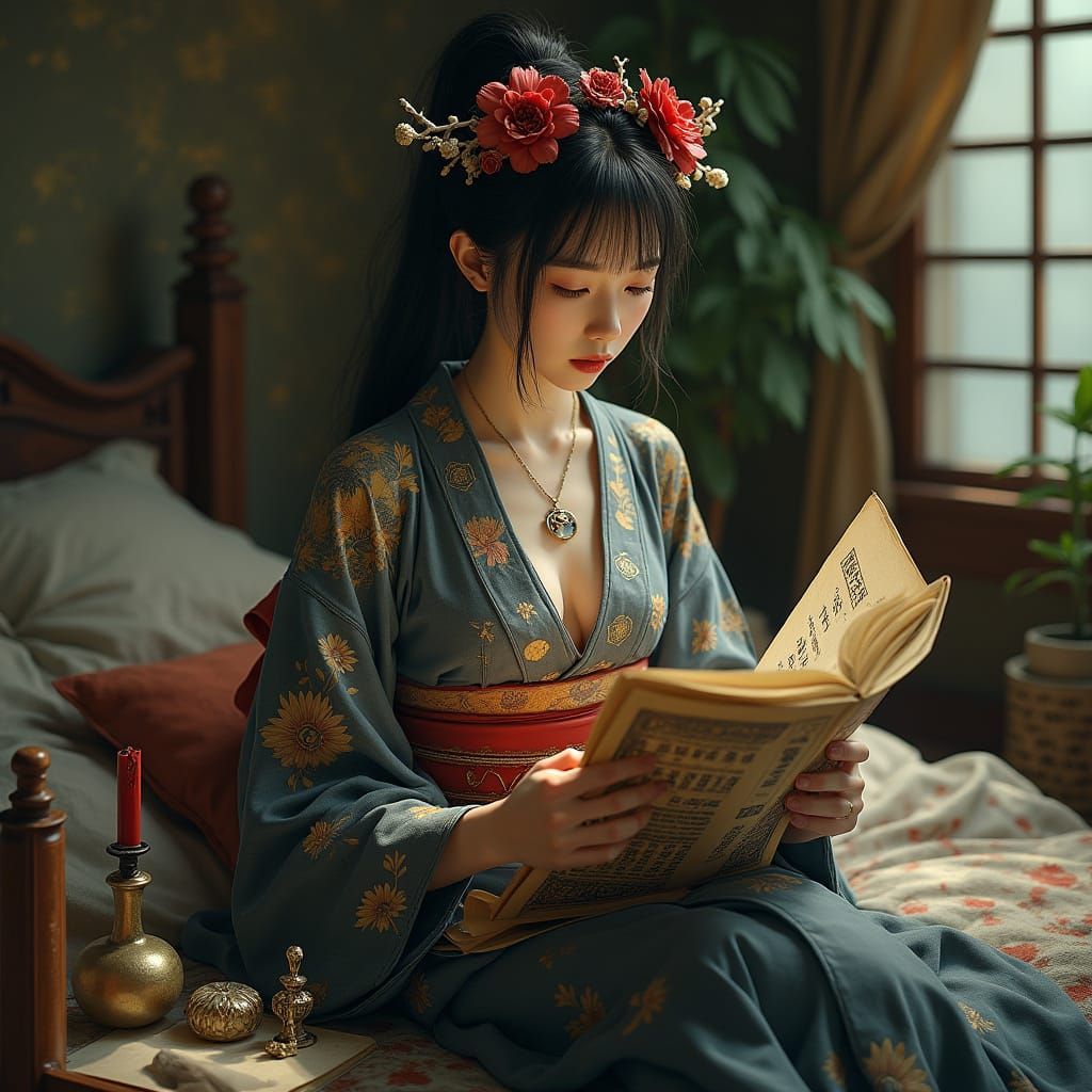 A captivating portrait of a Japanese witch reading an ancient scroll in her softly lit bedroom. The image blends Japanese elements with surreal accents in a dreamy and hyperrealistic style.