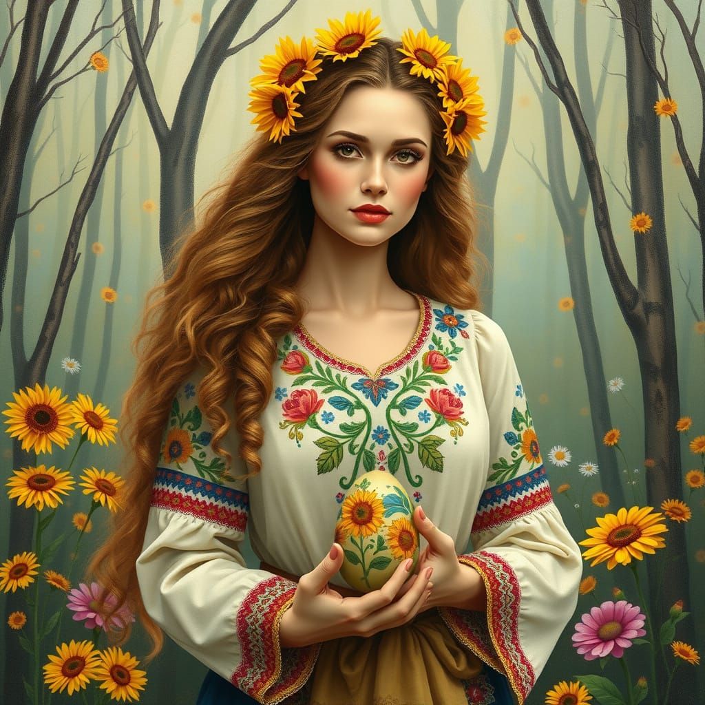 This image shows a woman embodying the Spirit of Ukraine, surrounded by vibrant, mutated wildflowers in a radioactive-free zone. She wears a traditional vyshyvanka blouse and cradles a delicate pysanka egg, symbolizing hope and renewal in a dreamy, ethereal atmosphere, blending Ukrainian folk art with my...