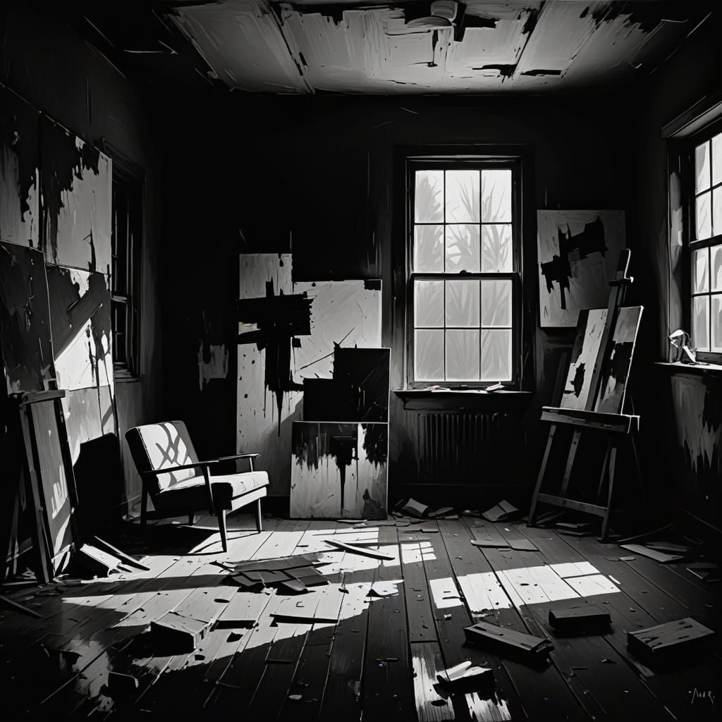 This image captures a dimly lit oil painting studio in high contrast black and white, featuring a giant old couch and a stretched canvas on an easel, with intense sunlight casting a beam of light through the dusty air, creating a moody atmosphere reminiscent of Abstract Expressionism and Franz Kline's st...