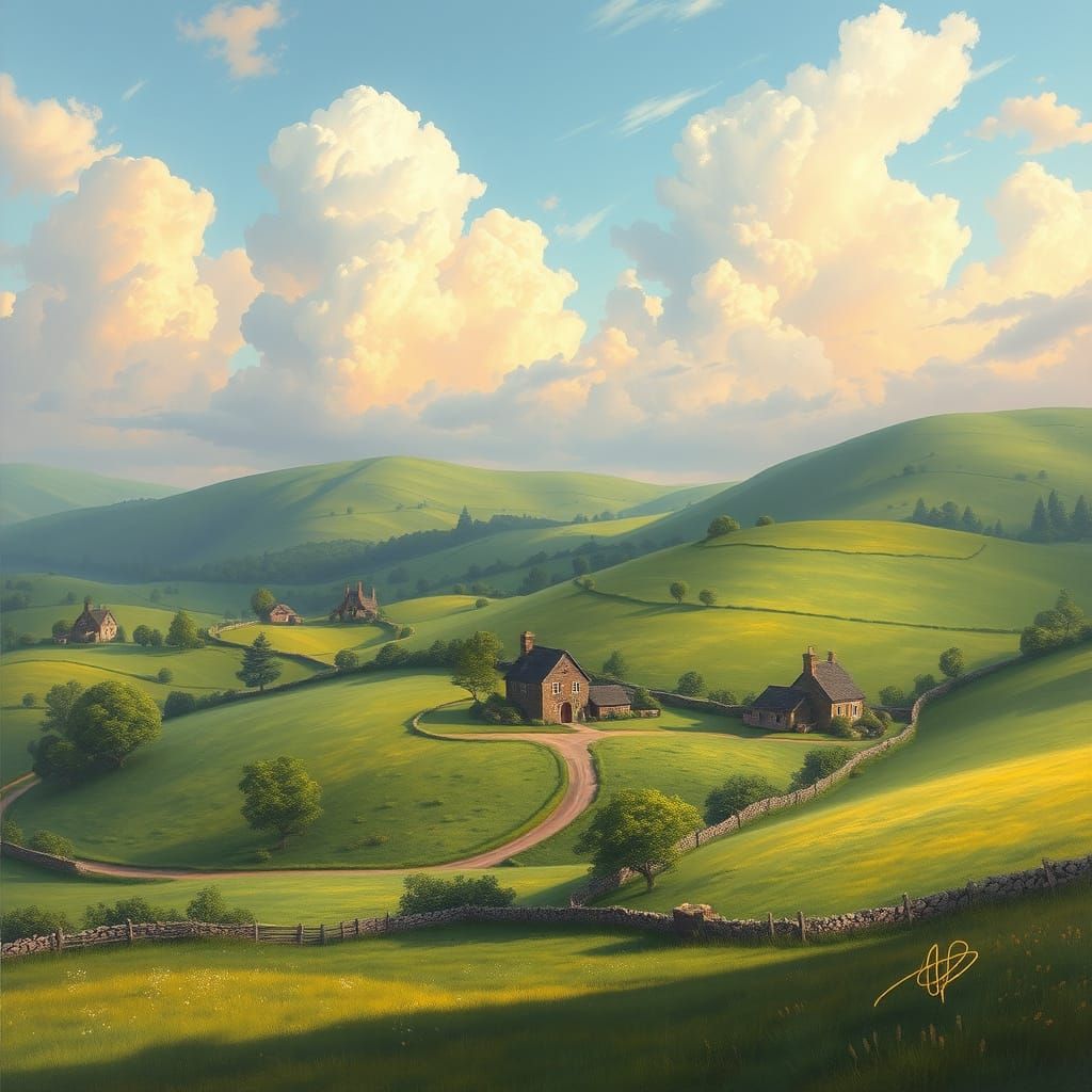 A picturesque countryside scene featuring green fields and stone cottages under a pastel sky. The image evokes classic impressionism with a touch of modern fantasy, creating a warm and inviting atmosphere.