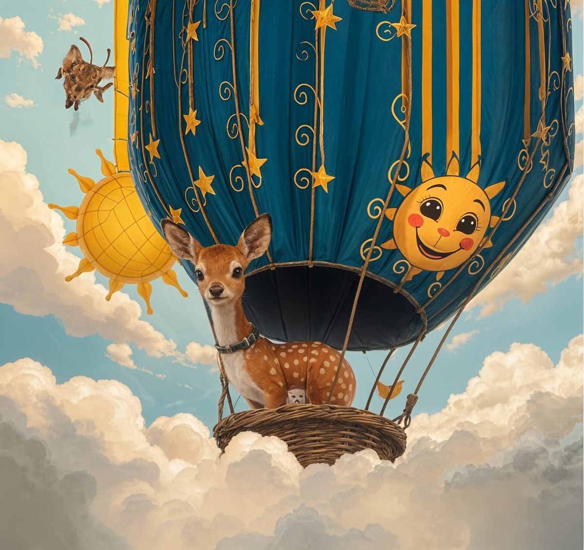 This image shows a fawn in a hot air balloon basket. Above, a radiant sun shines over fluffy clouds. The scene is rendered with the thick brushstrokes of impasto.