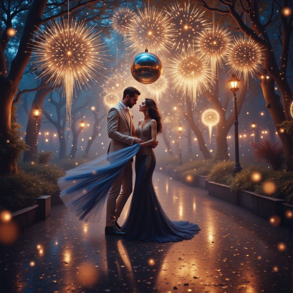 A stunning image captures a dancer in a beautiful gown performing elegantly beneath a giant New Year's Eve ball as midnight approaches.